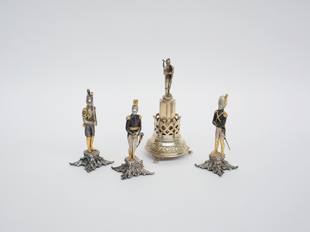 Lotto composto da una scultura in argento raffigurante un suonatore di cornamusa su piedistallo (gr 170) e tre soldatini in metallo dipinto (lievi difetti)