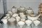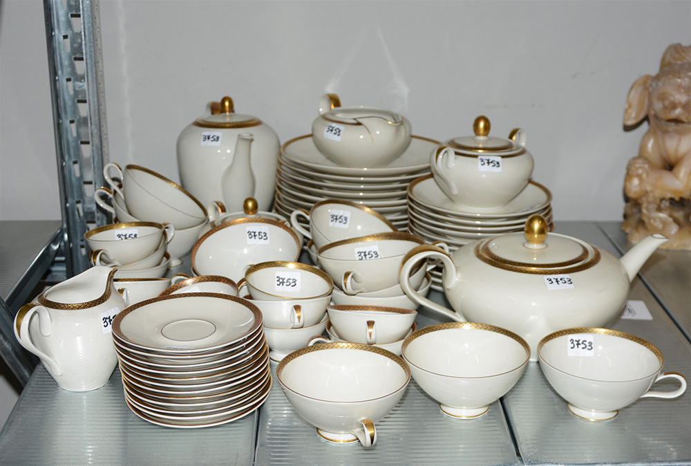 Manifattura tedesca. Servizio da the e caffè composto da teiera, caffettiera, due lattiere, due zuccheriere, dodici tazze da the con piattini, dodici tazze da caffè con piattini e dodici piattini per dolci, in porcellana bianca con profilo dorato (lievi difetti)