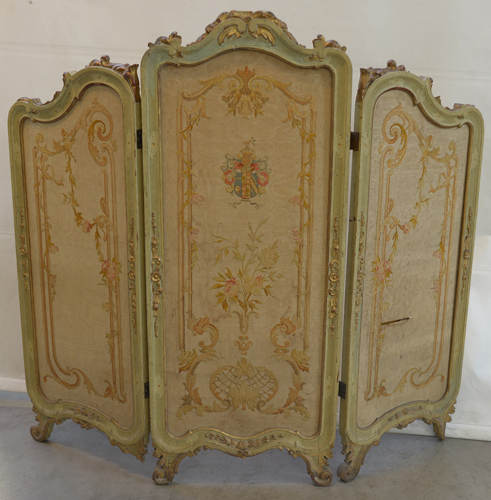 Paravento a tre ante di forma sagomata in legno laccato e parzialmente dorato, intagliato a motivi vegetali. Pannelli in stoffa ricamata a vasi fioriti e stemma nobiliare. Inizio sec. XIX (h cm 160x140) (difetti)