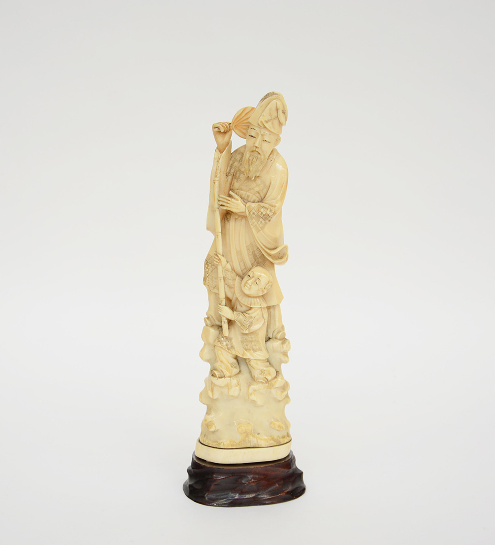 Okimono in avorio raffigurante un saggio con ventaglio e fanciullo con base...