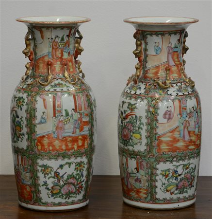 Coppia di vasi Famiglia Rosa Cantonese in porcellana decorata in policromia con scene di vita, fiori e uccelli (h cm 45) Cina sec. XX (lievi difetti)
