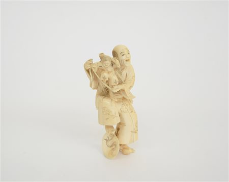 Okimono in avorio raffigurante un giocoliere con fanciullo (lievi...