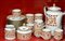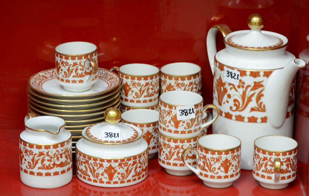 Manifattura tedesca. Servizio da caffè in porcellana decorato a motivi in rosso e profilo dorati su fondo bianco, composto da caffettiera, lattiera, zuccheriera, undici tazzine con dodici piattini