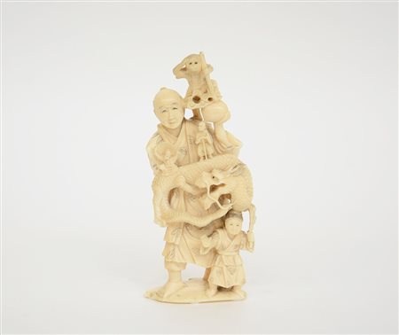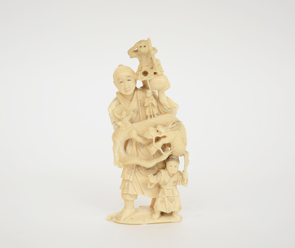 Okimono in avorio raffigurante saggio con bambini, drago e scimmia (lievi difetti)