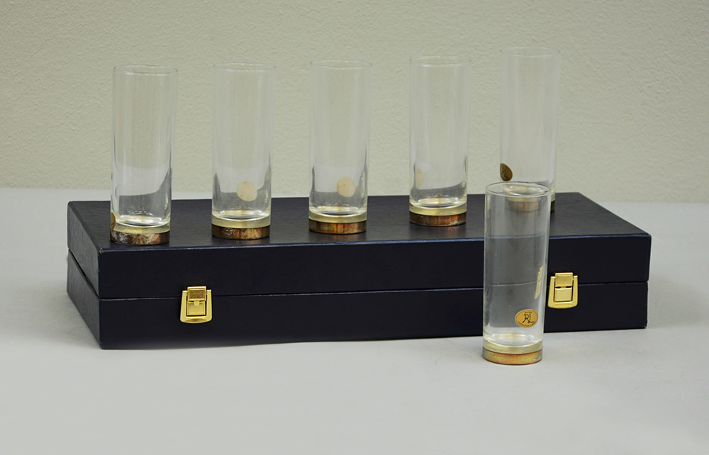 Servizio di sei bicchieri a "cilindro" con profilo in argento alla base, in custodia originale