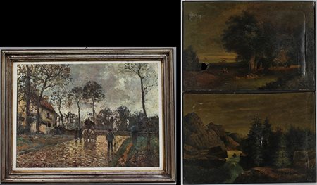 Lotto composto da una coppia di dipinti ad olio su tela raffiguranti paesaggi (cm 50x74) ed una riproduzione su tela da un'opera di Camille Passarro (cm 54x73), in cornici (lievi difetti)