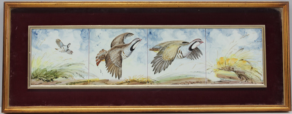 "Pernici" 1978, composizione di quattro piastrelle dipinte (cm 20x80), firmata in basso a destra, si allega certificato dell’artista; in cornice