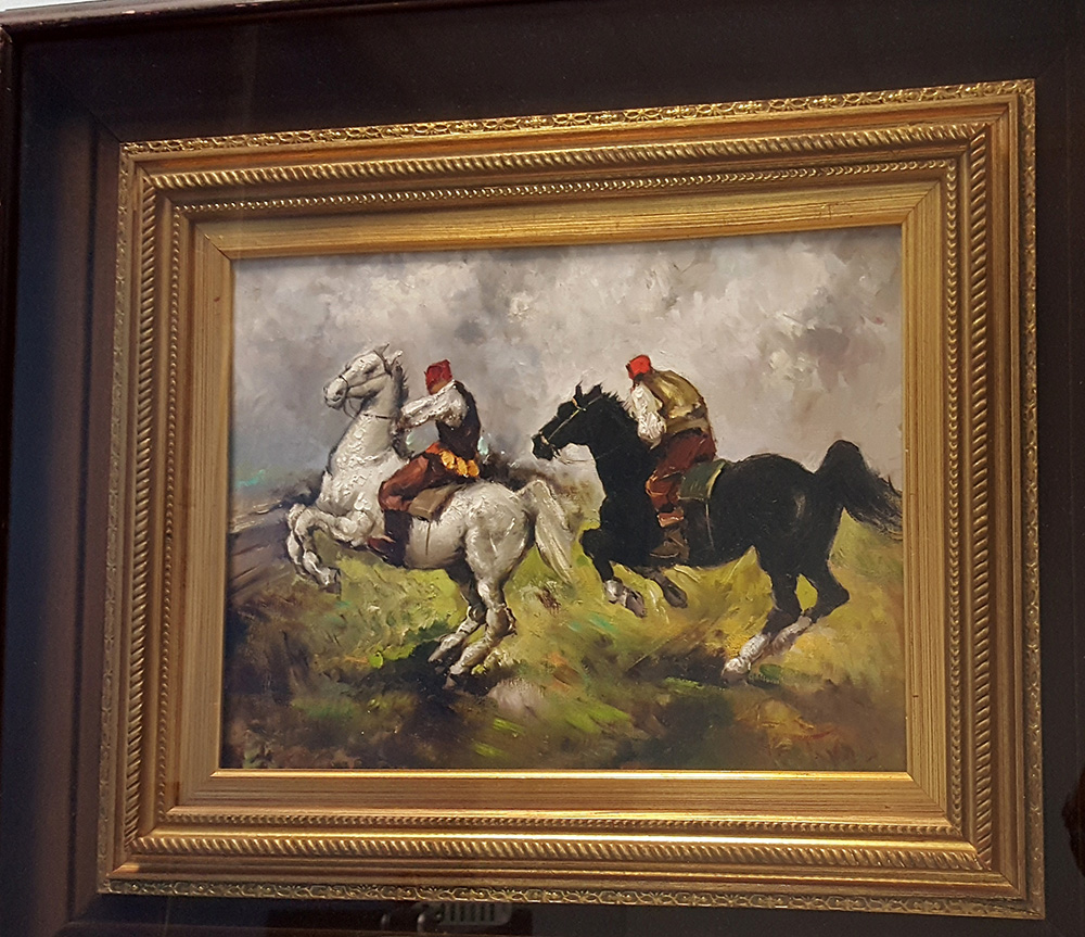 Anonimo, "Cavalieri", olio su tela cm 40x30, firma in basso a dx ed al retro