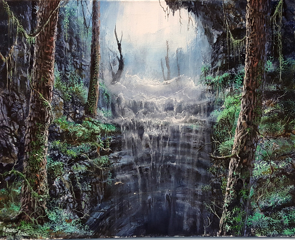Mauro Pani, "La grande cascata", acrilici su tela cm 40x50, firma e anno in basso a sx