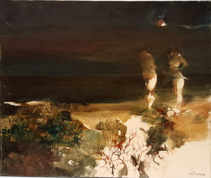 Mario Pitocco, "Due figure sulla spiaggia", 1971, olio su tela cm 50x60, firma in basso a dx, firma titolo e autentica dell'Artista al retro