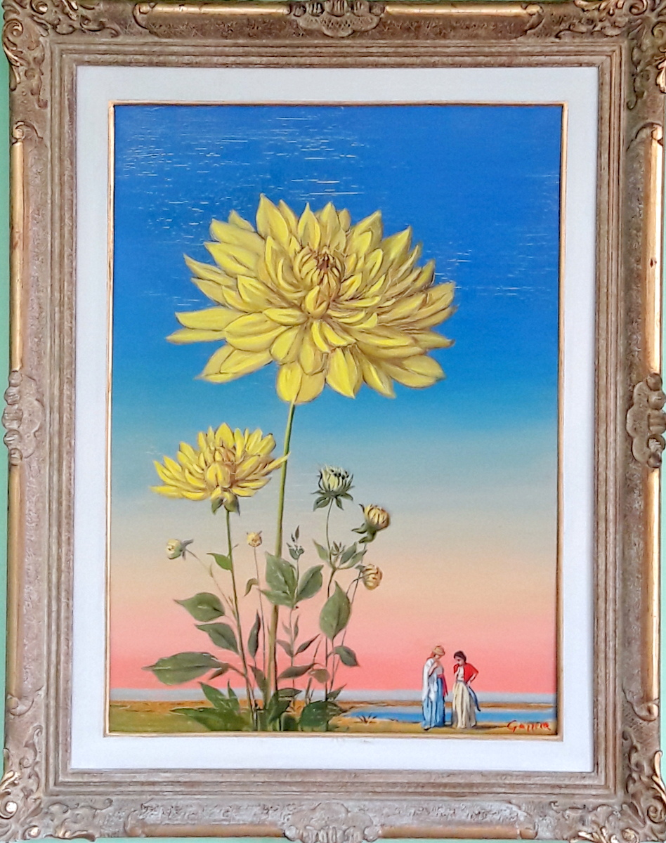 Romano Gazzera, "Dalie gialle", 1974, olio su tela cm 70x50, firma in basso a dx, titolo firma e data al retro