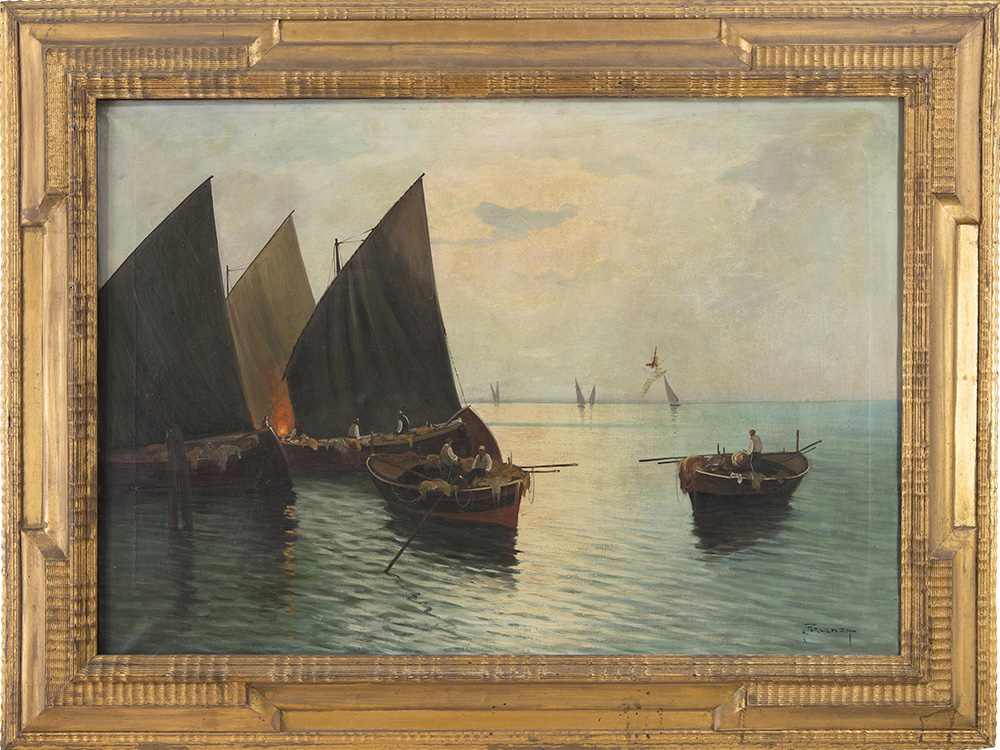 Eduardo Forlenza (1861-1934), Olio su tela, Barche con pescatori 70x100 cm