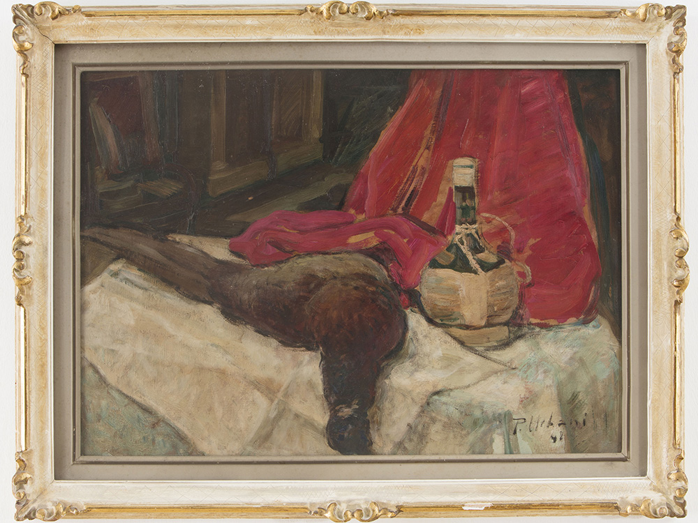 Piero Urbani (1913-1992), Olio su faesite, Natura morta con fagiano e fiaschetto 50x69,5 cm