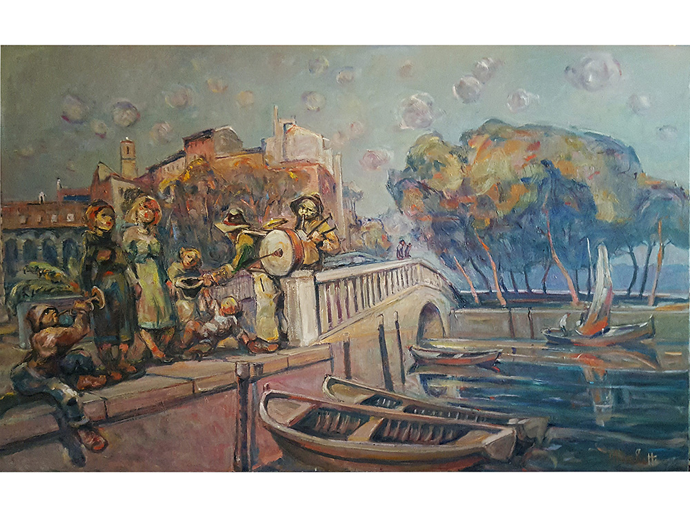 Tancredi Muchetti (1932), Olio su tela, Suonatori ambulanti a Desenzano del Garda 120x200 cm