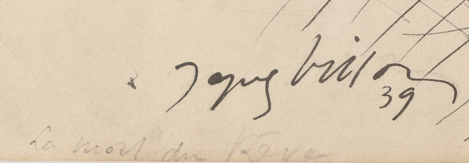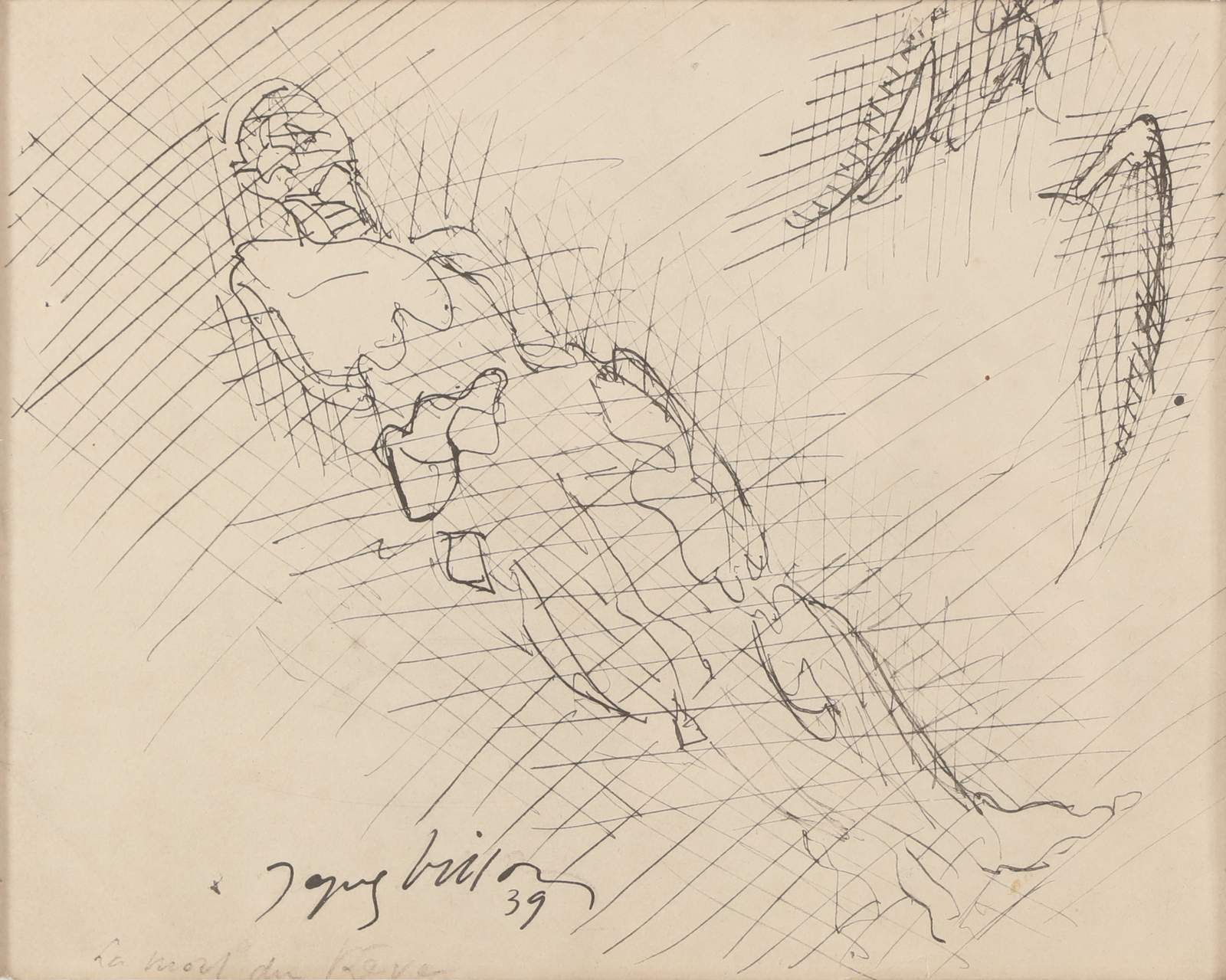 ANONIMOUS La morte du Réve. 1939. Ink on paper. Cm 30,00 x 20,00. Signature, title and year lower left. Small defects. Cornice presente