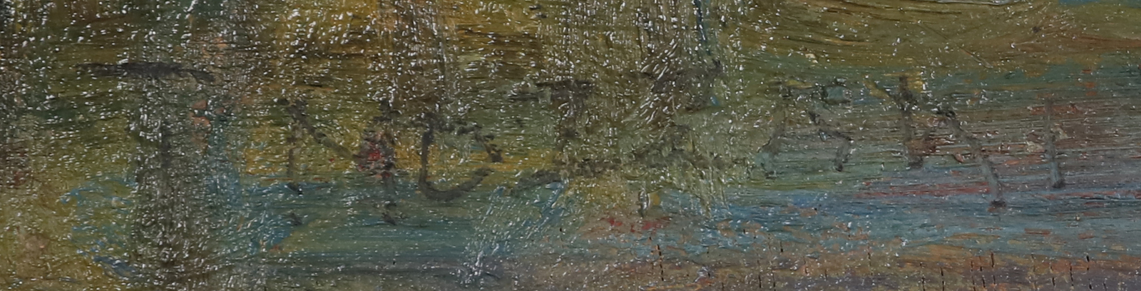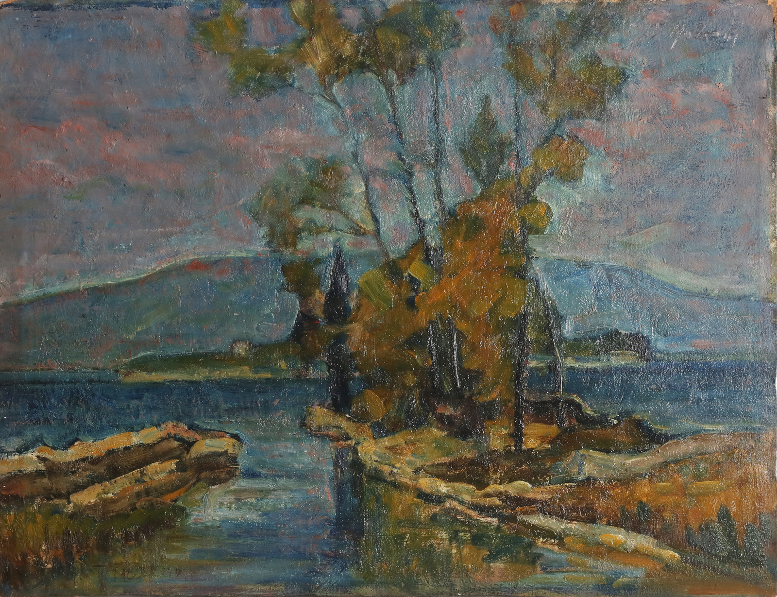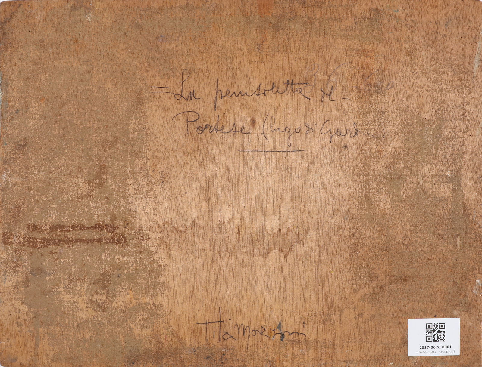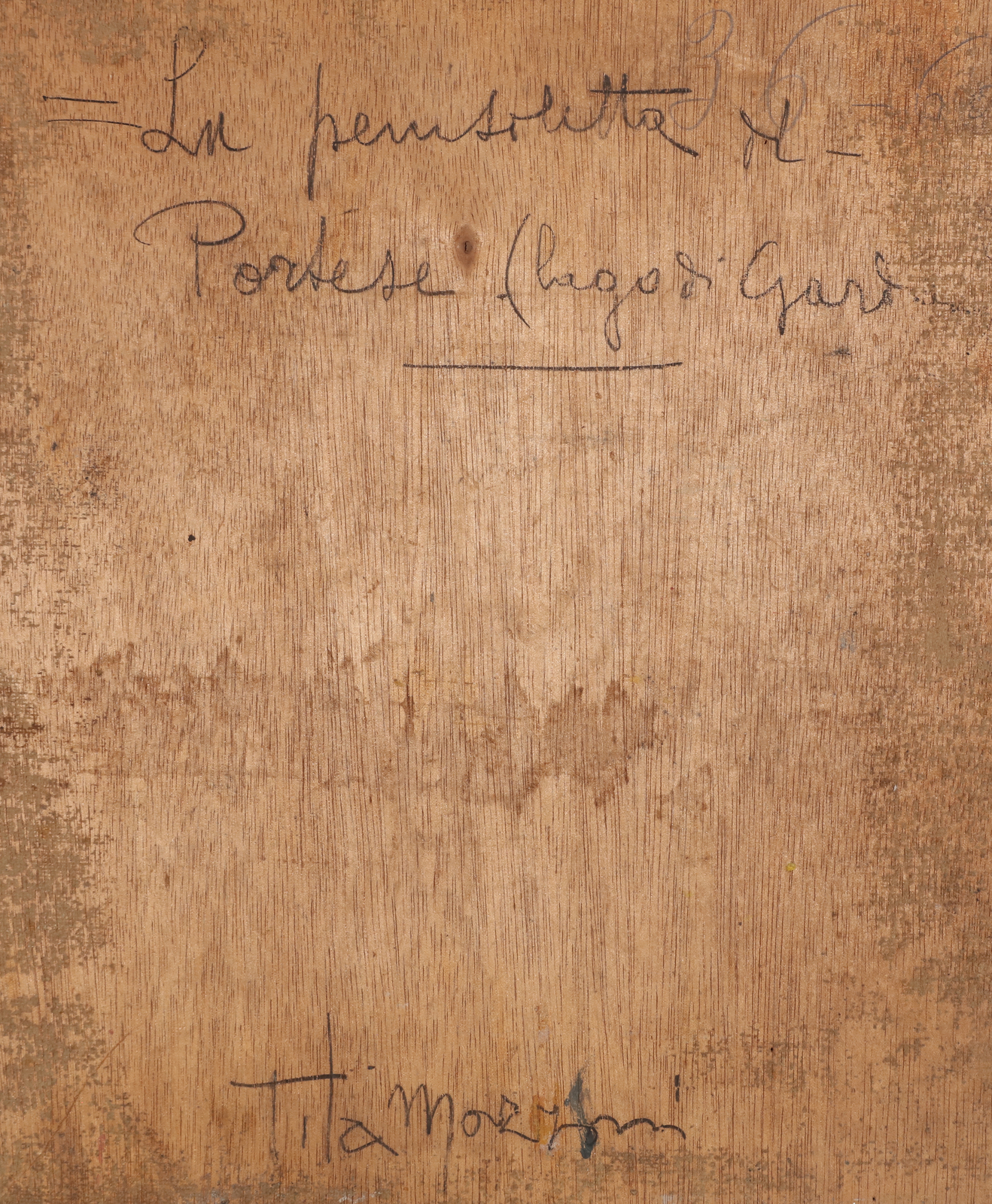 MOZZONI TITA (1894 - 1986) La penisoletta di Portese (Lago di Garda). Olio su tavoletta. Cm 50,00 x 38,00. Firma in alto a destra e in basso a sinistra. Al retro titolo e firma. Cornice presente