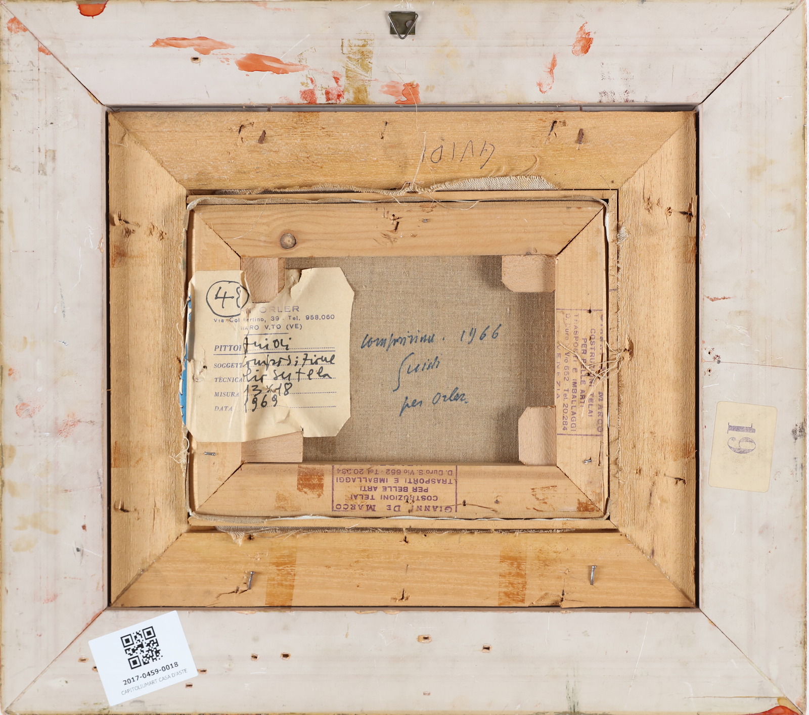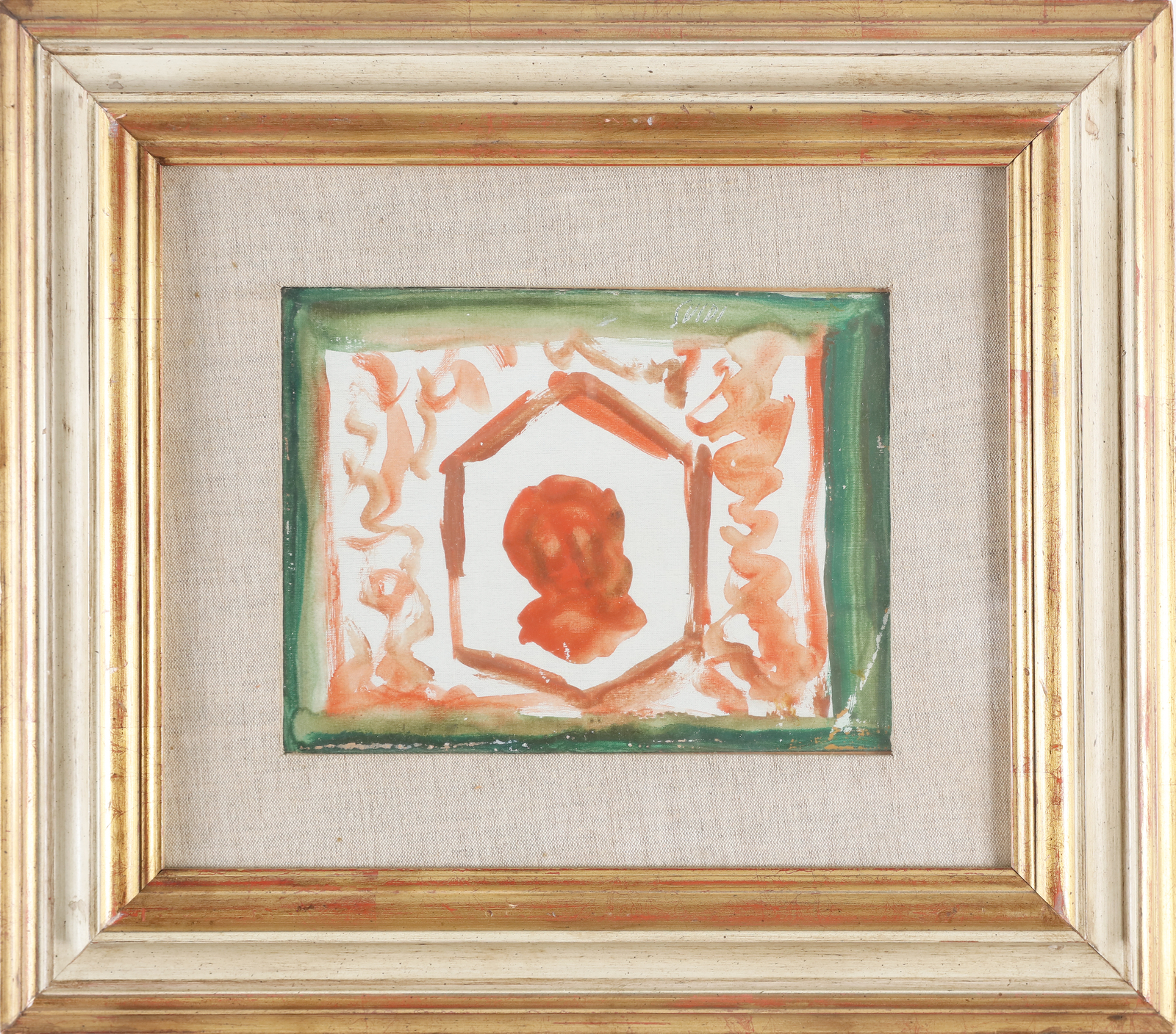 GUIDI VIRGILIO (1891 - 1994) Composition. 1966. Oil on canvas . Cm 24,00 x 18,00. Signature upper right. At the back title, signature, year and dedication. Fratelli Orler, Favaro label. Artist's autehnticity certificate on photo. Cornice presente