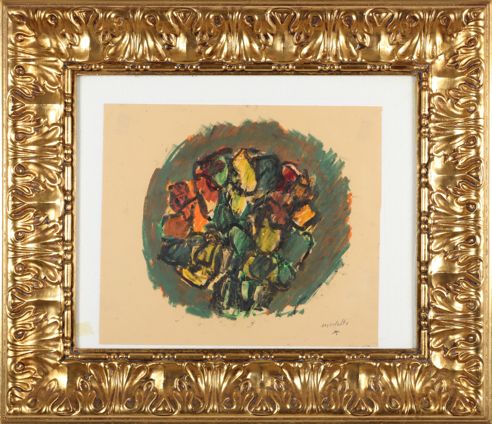 MORLOTTI ENNIO (1910 - 1992) Rose. 1992. Tecnica mista su cartoncino. Cm 40,00 x 35,00. Firma in basso a destra. Autentica dell'artista su fotografia. Cornice presente
