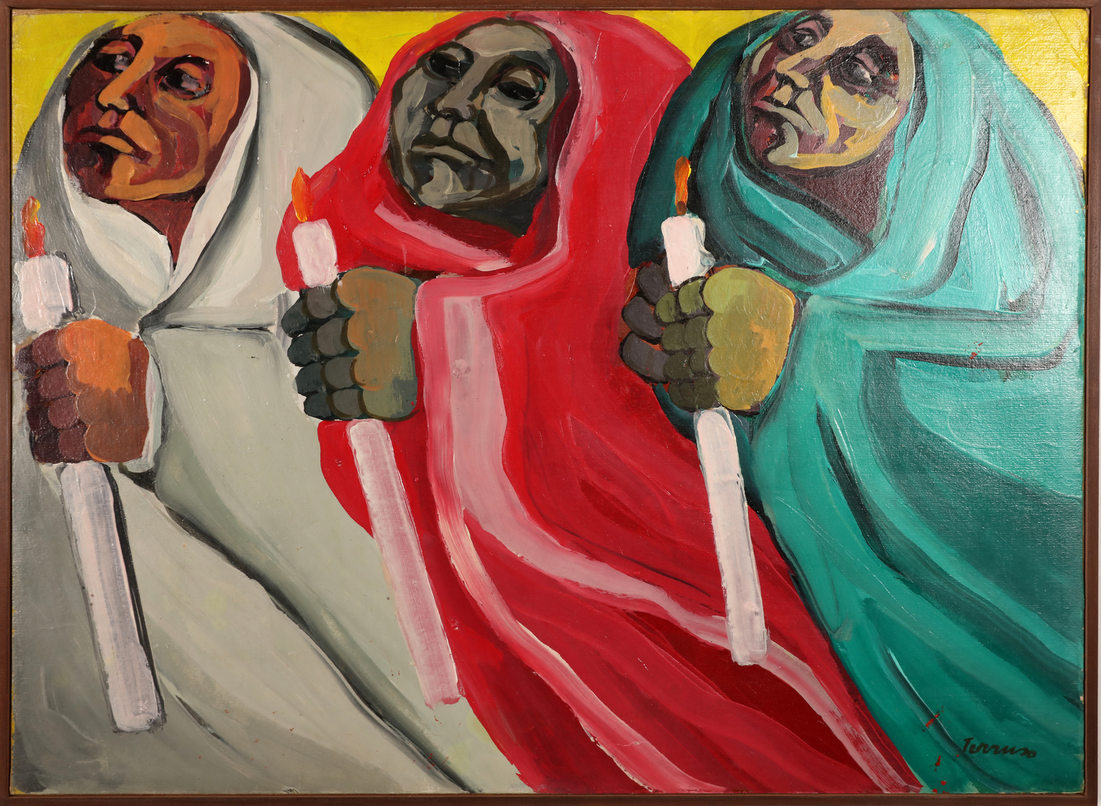 TERRUSO SAVERIO (1939 - 2003) Processione. Acrilico su tela. Cm 78,00 x 57,30. Anni '80. Firma in basso a destra. Presenti lievi difetti.