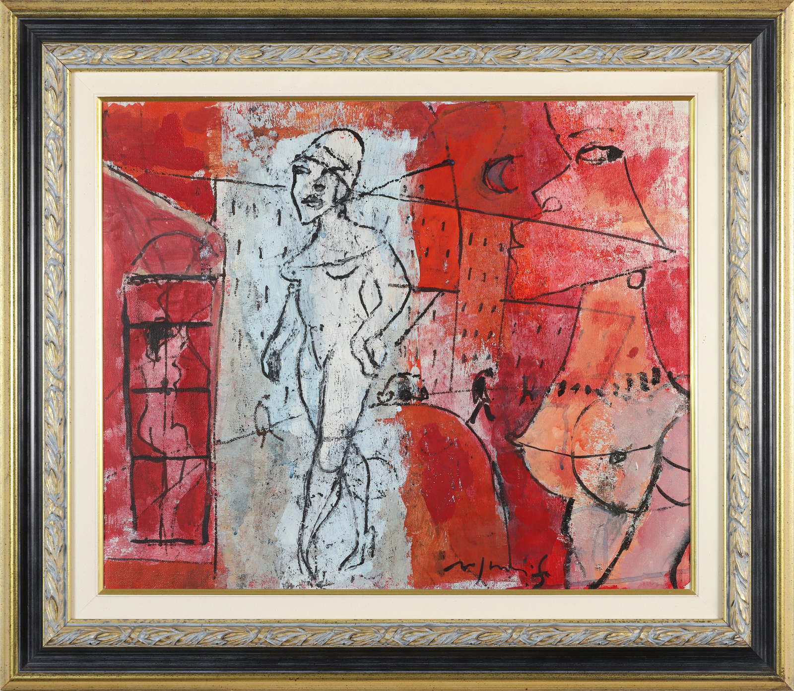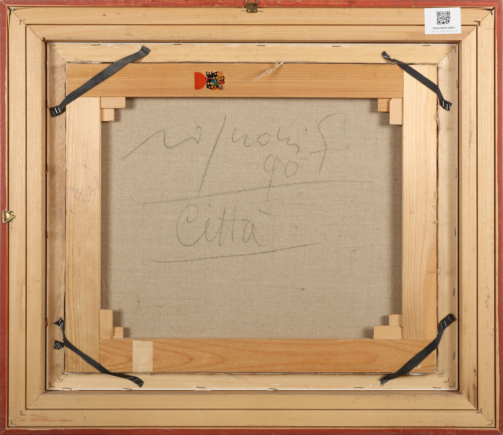 ROGNONI FRANCO (1913 - 1999) City. 1990. Oil on canvas . Cm 54,00 x 46,00. Signature lower right. At the back title, signature, year and ArteFiera96 label. Artist's authenticty certificate on photo. Cornice presente