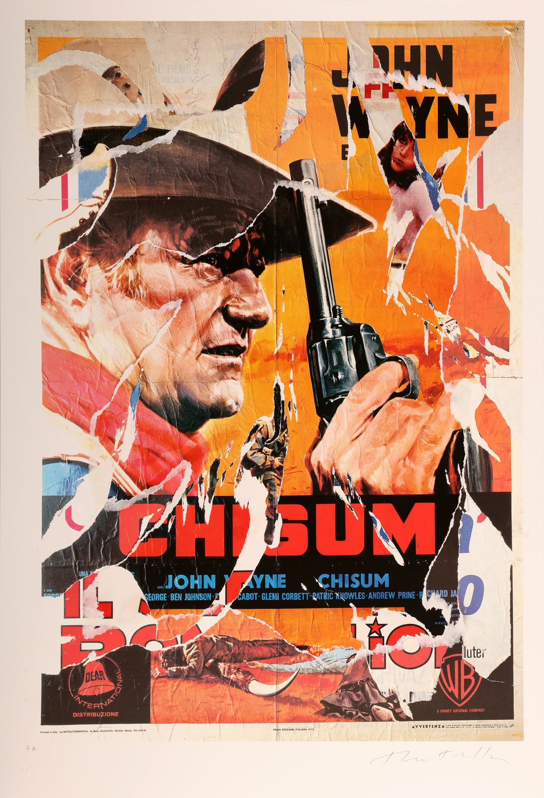 ROTELLA MIMMO (1918 - 2006) Chisum. Litodecollage. Cm 70,00 x 100,00. P.a. Tiratura e firma a matita in basso. Timbro a secco Fondazione Mimmo Rotella, Milano in basso a sinistra. Pubblicazioni: Mimmo Rotella - multiples décollages a cura di Elena Pontiggia, SilvanaEditoriale, 2005, pag. 60 - 61.