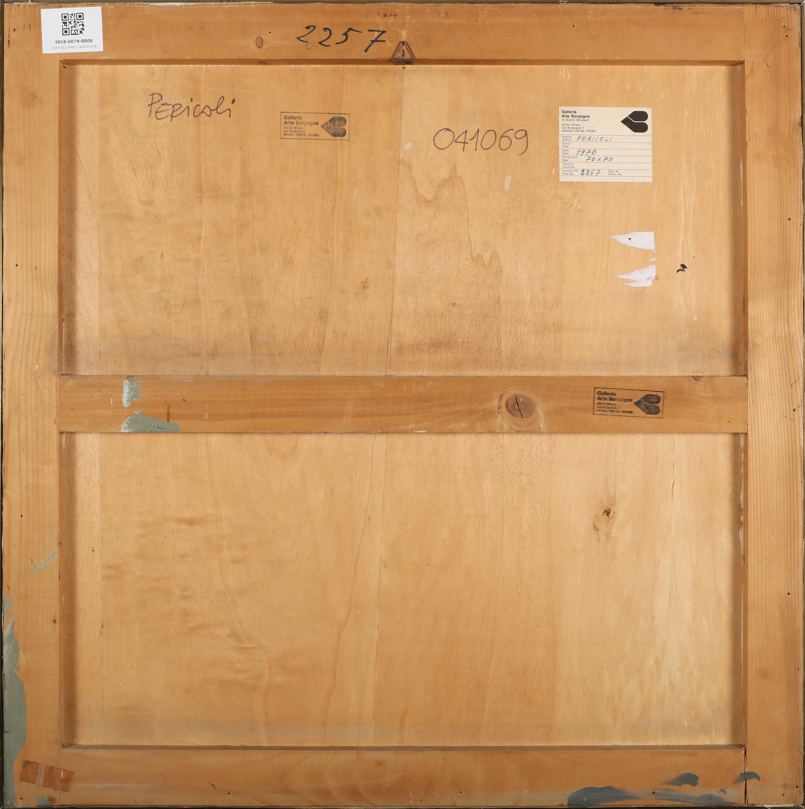 PERICOLI TULLIO (1936 - 2006) Senza titolo. 1970. Tecnica mista su tela su tavola. Cm 70,00 x 70,00. Al retro firma e cartiglio descrittivo Galleria d'arte Borgogna, Milano con timbro. Provenienza: Galleria d'Arte Borgongna, Milano; Collezione privata, Milano; Pandolfini Casa d'aste, Firenze, lotto 248 asta 15/08/2009.