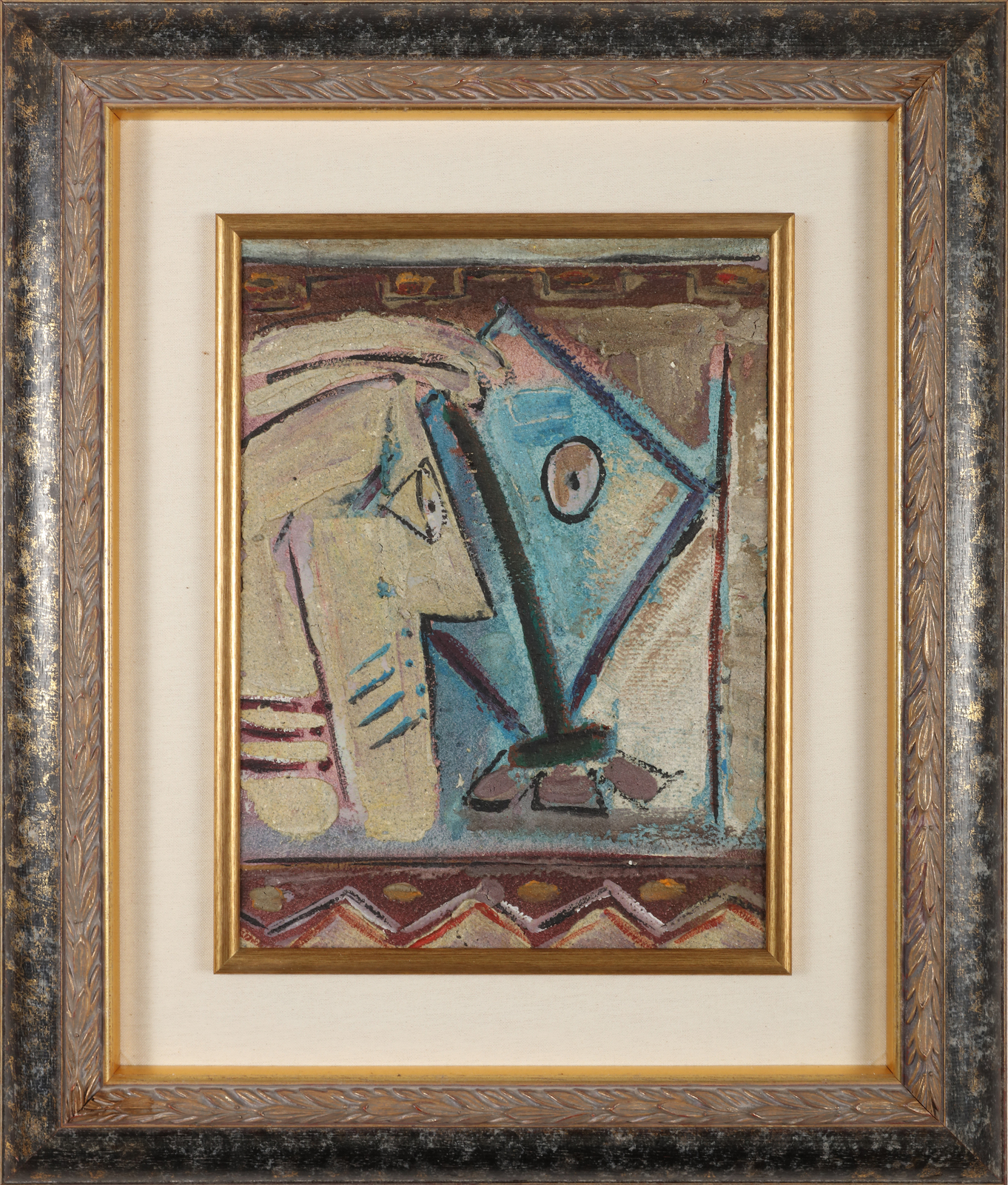 MAGGIONI PIERO (1931 - 1995) Primitivo. Tecnica mista su tavola. Cm 30,00 x 40,00. Firma al retro.Autentica di Antonio Maggioni su fotografia. Anni '70. Cornice presente