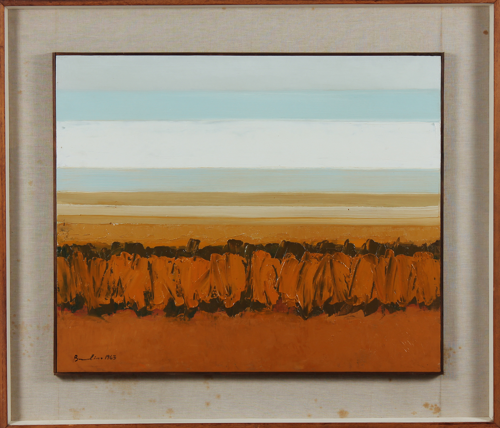 BRUSAMOLINO GIANNI (n. 1928) Story. 1963. Oil on canvas . Cm 73,00 x 60,00. Signature and year lower left. At the back signature, title and year, Cornice presente