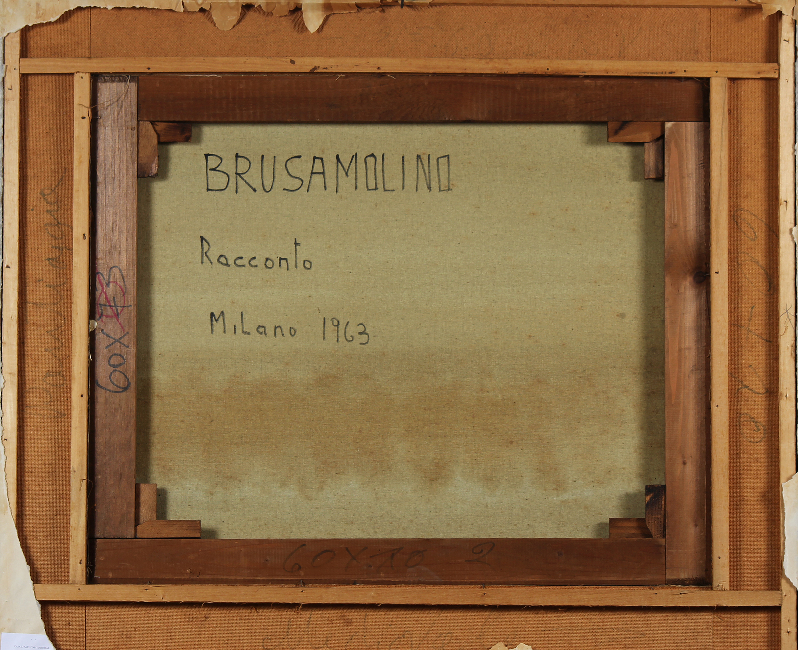 BRUSAMOLINO GIANNI (n. 1928) Racconto. 1963. Olio su tela . Cm 73,00 x 60,00. Firma e data in basso a sinistra. Al retro firma, titolo e anno. Cornice presente