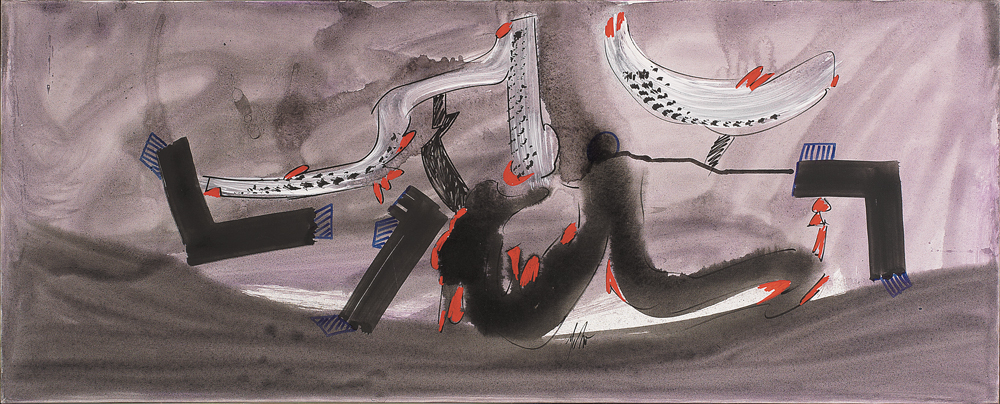 SERGIO DANGELO Milano 1932 Rissa allo scoglio, 2005 smalti e tempere su tela cm. 50x125, firma in basso al centro, titolo e firma al retro, dichiarazione d'autenticità dell'artista su foto, pubblicato sul catalogo "L'orizzonte e il vulcano, il vulcano e l'orizzonte", Tommaso Trini per Sergio Dangelo e Giorgio Moiso, Bocca Edizioni, pagina 11.