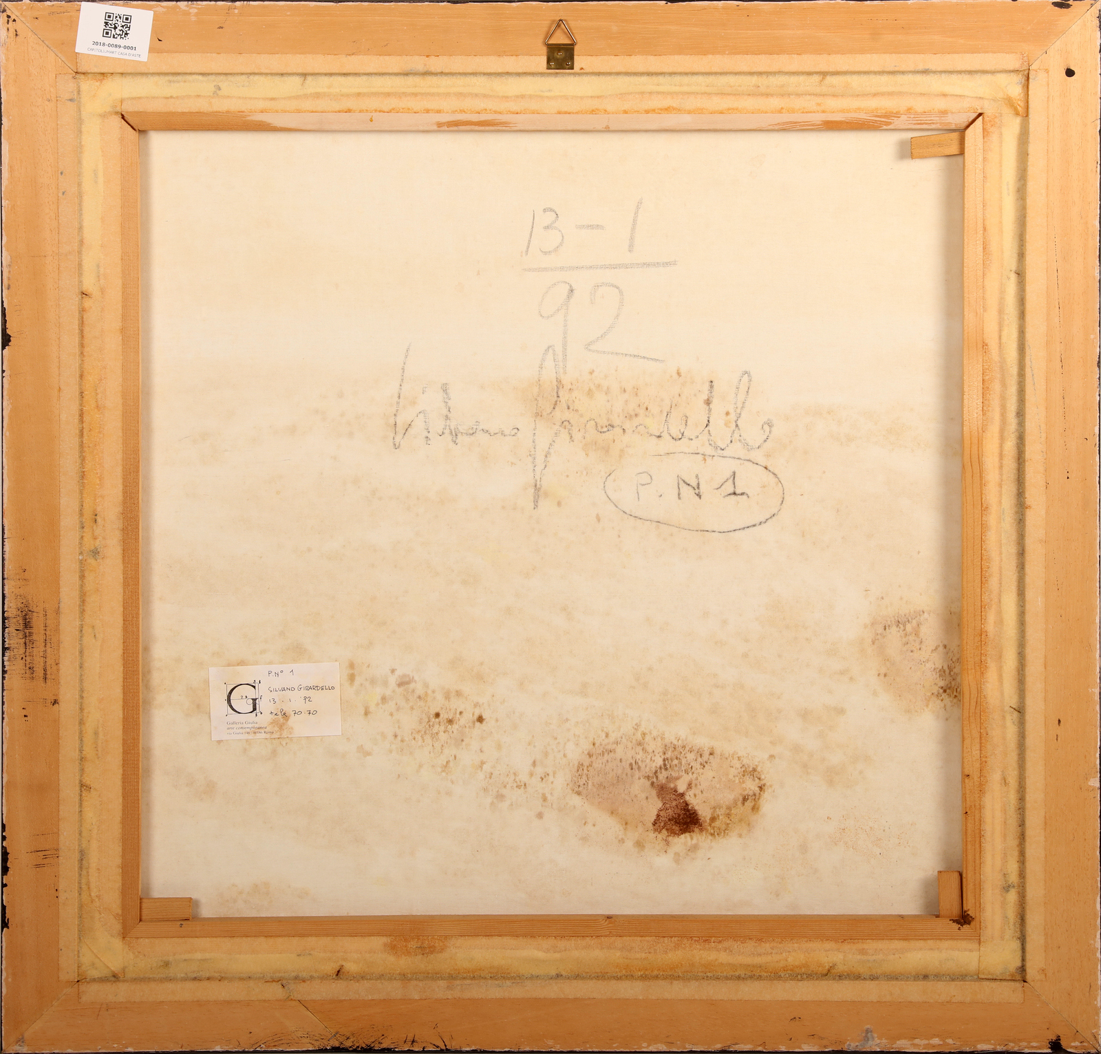 GIRARDELLO SILVANO (1928 - 2016) Senza titolo. 1992. Tecnica mista su tela. Cm 70,00 x 70,00. Al retro firma, anno e cartiglio descrittivo Galleria Giulia Arte Contemporanea, Roma-. Cornice presente