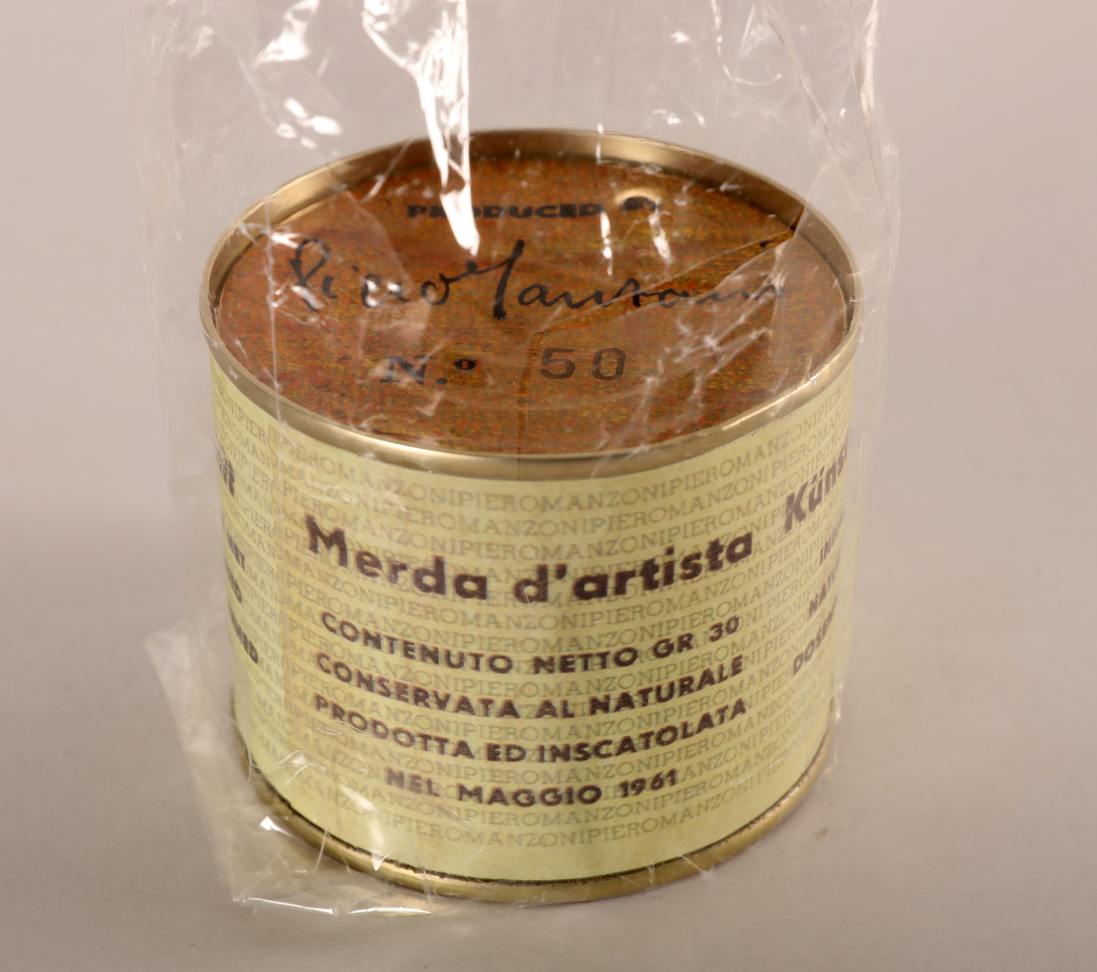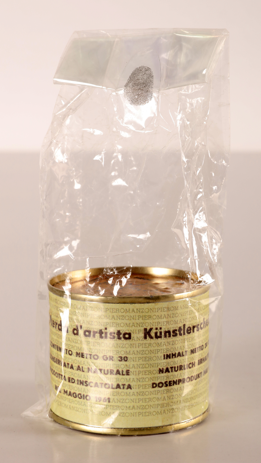 MANZONI PIERO (1963 - 2013) Merda d'artista. Multiplo. Cm 6,50 x 7,50. N. 50. Firma e tiratura sul coperchio. Merda d'Artista dell'anniversario, Maggio 2013. Prodotta ed inscatolata dalla Fondazione Piero Manzoni, Milano. Presente impronta a rilievo sulla chiusura. Pubblicazione: Breve Storia della merda d'Artista, Skira 2014