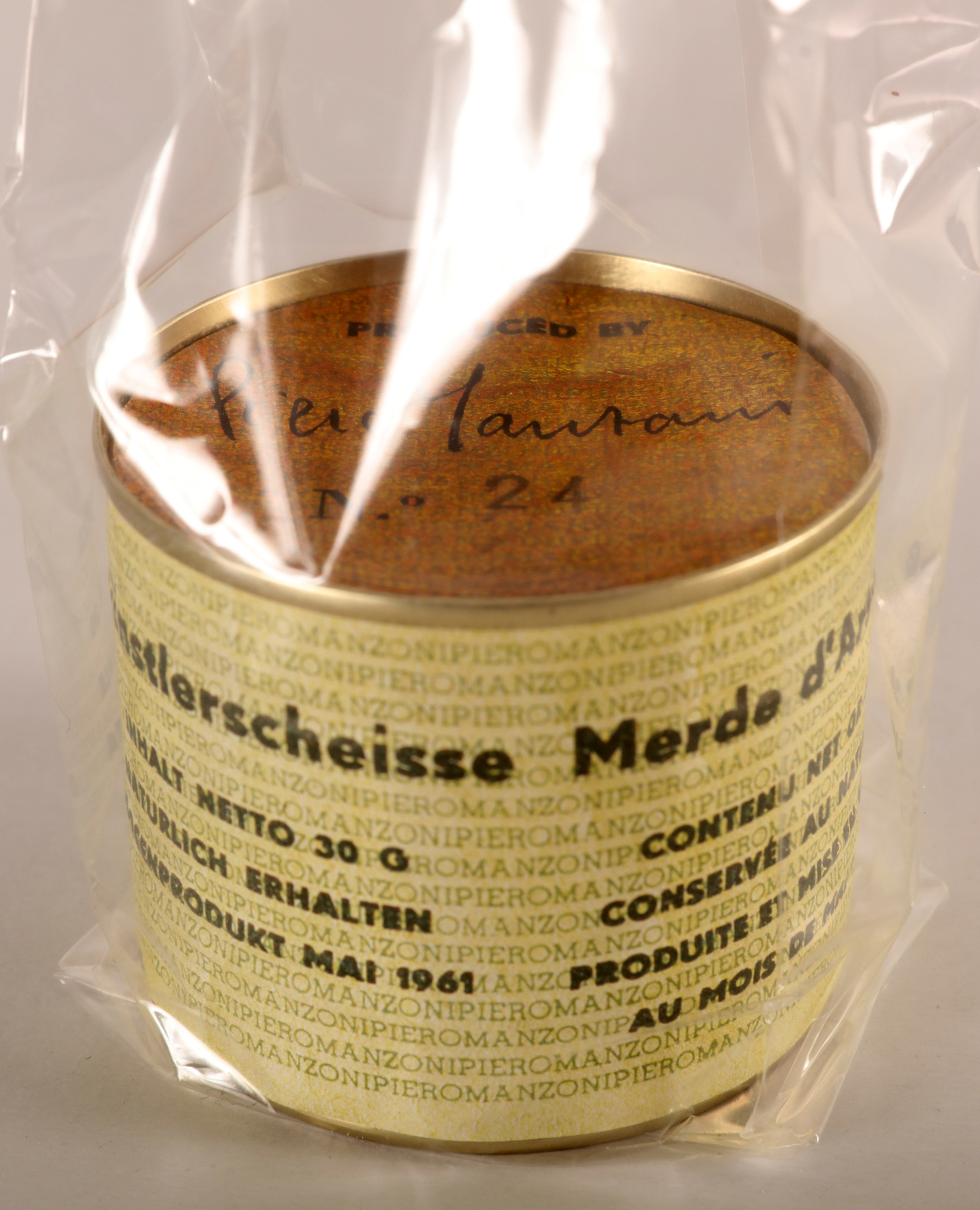 MANZONI PIERO (1963 - 2013) Merda d'artista. Multiplo. Cm 6,50 x 7,50. N.24. Firma e tiratura sul coperchio. Merda d'Artista dell'anniversario, Maggio 2013. Prodotta ed inscatolata dalla Fondazione Piero Manzoni, Milano. Presente impronta a rilievo sulla chiusura. Pubblicazione: Breve Storia della merda d'Artista, Skira 2016.