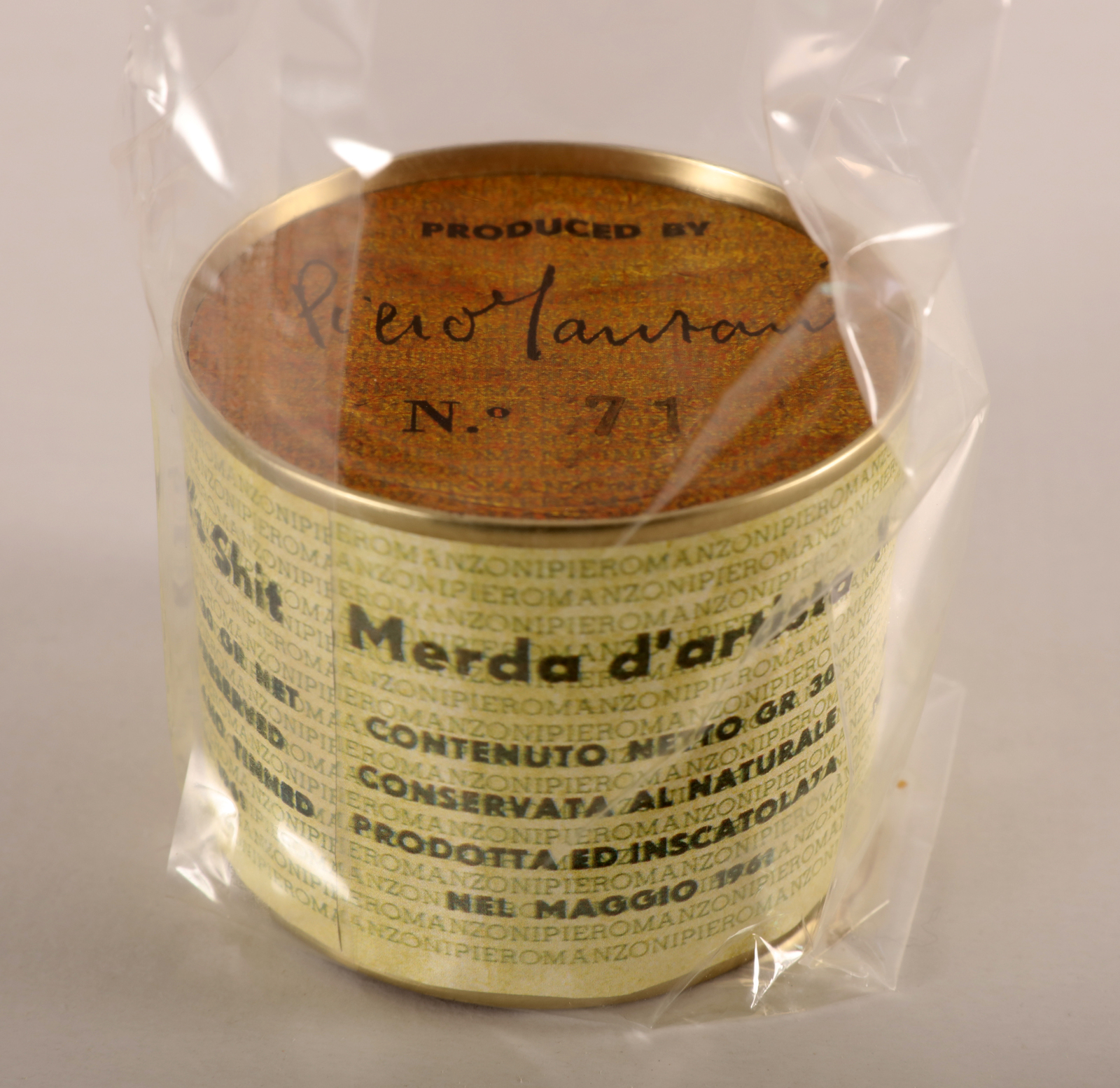 MANZONI PIERO (1963 - 2013) Merda d'artista. Multiplo. Cm 6,50 x 7,50. N.71. Firma e tiratura sul coperchio. Merda d'Artista dell'anniversario, Maggio 2013. Prodotta ed inscatolata dalla Fondazione Piero Manzoni, Milano. Presente impronta a rilievo sulla chiusura. Pubblicazione: Breve Storia della merda d'Artista, Skira 2016.