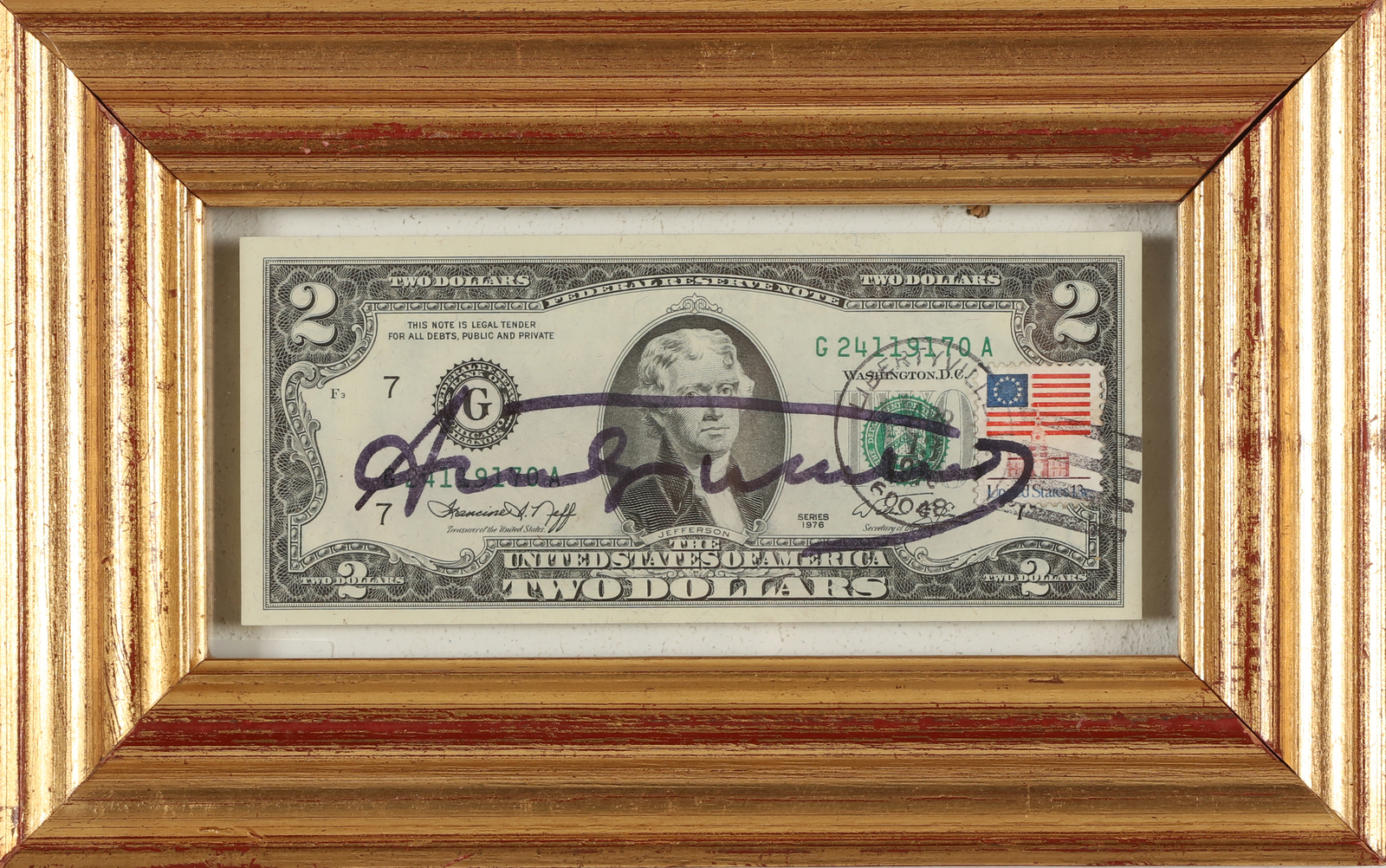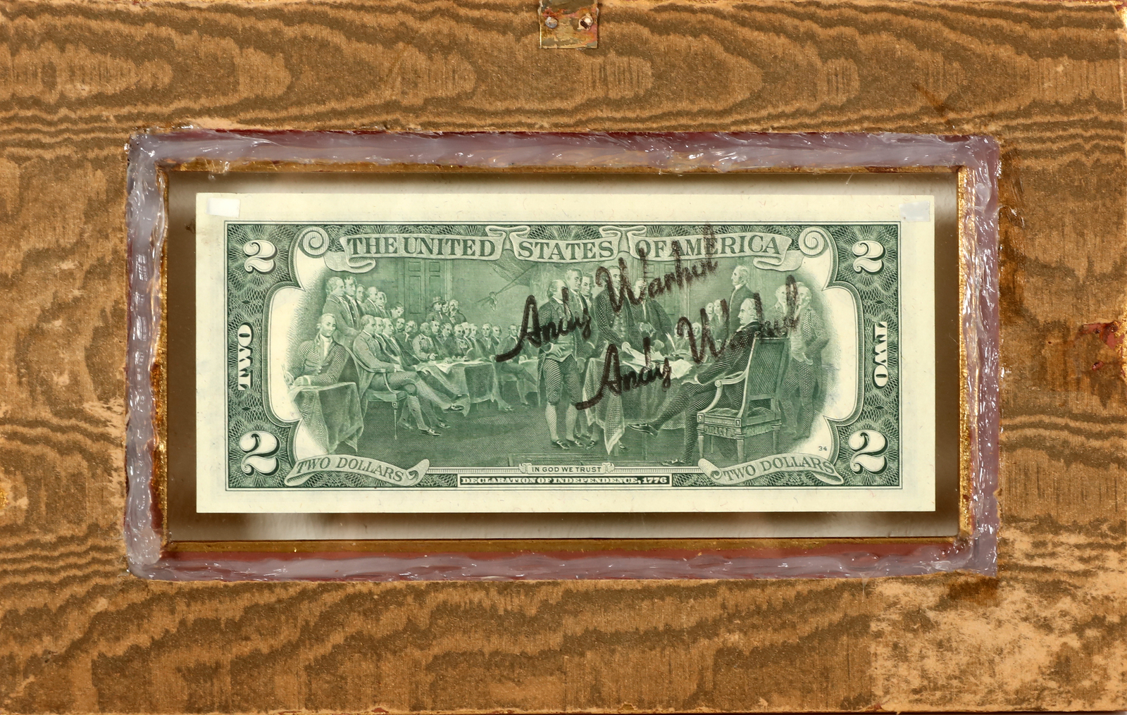 WARHOL ANDY (1928 - 1987) Two dollars. Intervento su banconota. Cm 15,50 x 6,50. Firma a pennarello. Al retro timbro dell'artista. Cornice presente