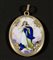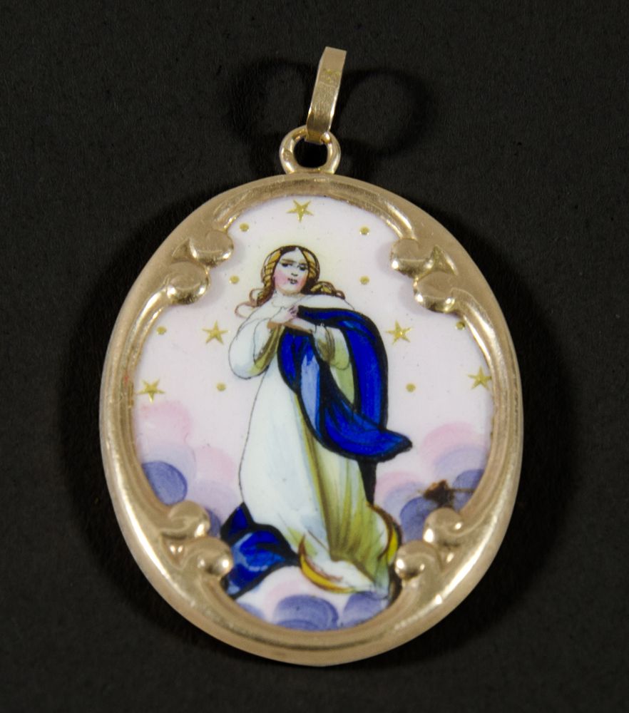 Ciondolo ovale con cornice in oro giallo, al centro medaglione in porcellana smaltata raffigurante Madonna.