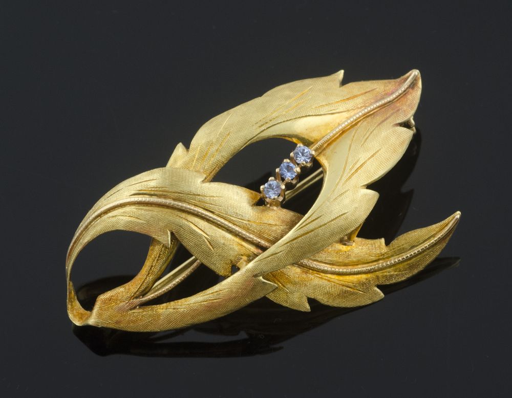 Spilla in oro giallo a forma di foglie con pietre colorate. Gr. 6.