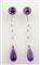 Orecchini pendenti in oro bianco e diamantini con ametiste di forma circolare su perno e finale a goccia.