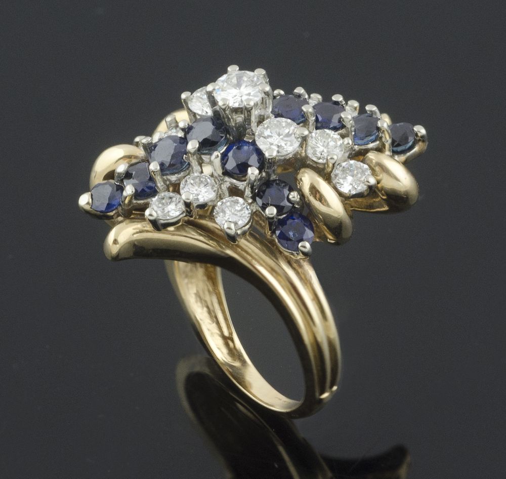 Anello in oro giallo con diamanti taglio brillante e zaffiri