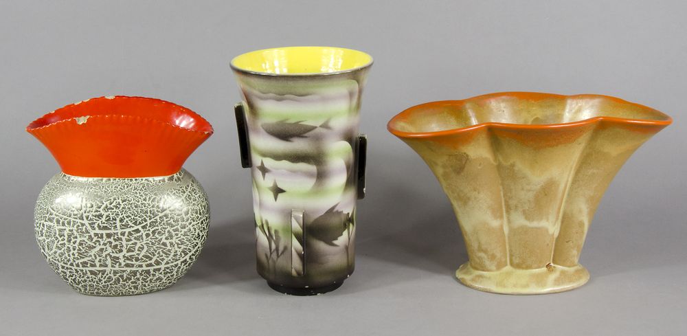 Lotto di 3 vasi in ceramica policroma. (difetti).