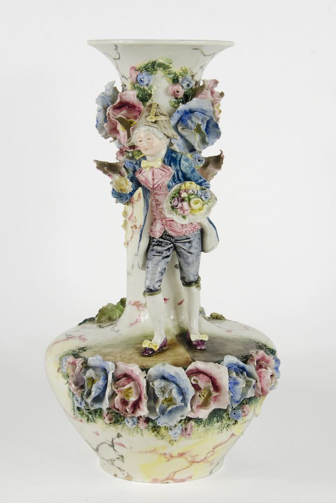 Grande vaso in ceramica policroma con figura e fiori applicati. H. cm. 41. (difetti).
