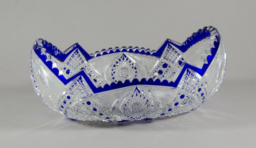 Grande centrotavola ovale in cristallo trasparente e blu.