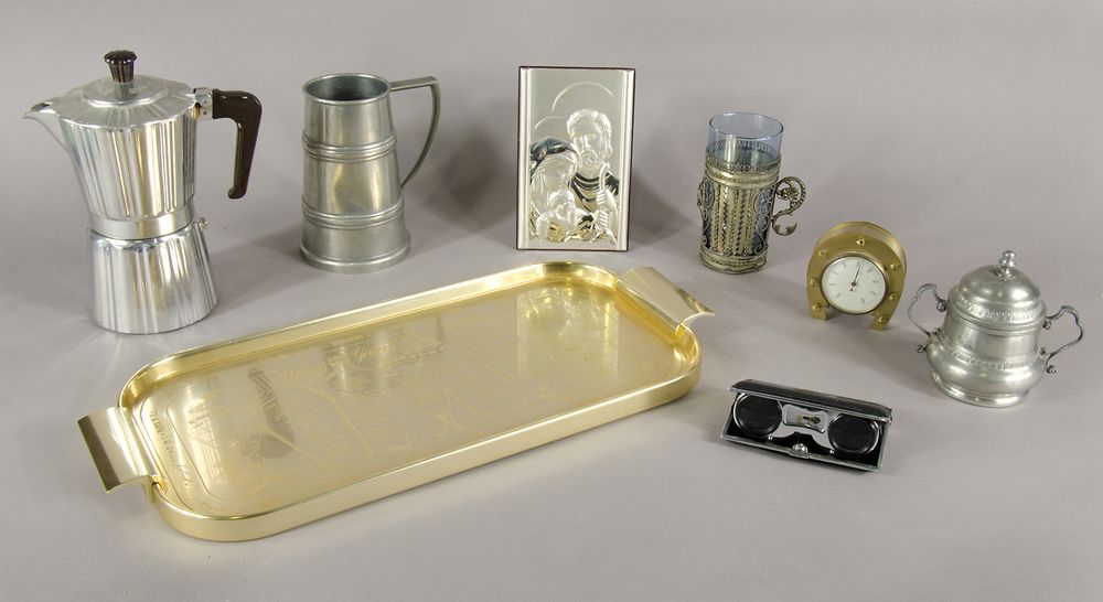 Lotto di vari oggetti in metallo tra cui vassoio, binocolo e caffettiera.
