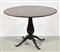 Tavolo rotondo in legno su gamba scanalata e piedi mossi. Anni '60. H. cm. 77, diam. cm. 110.