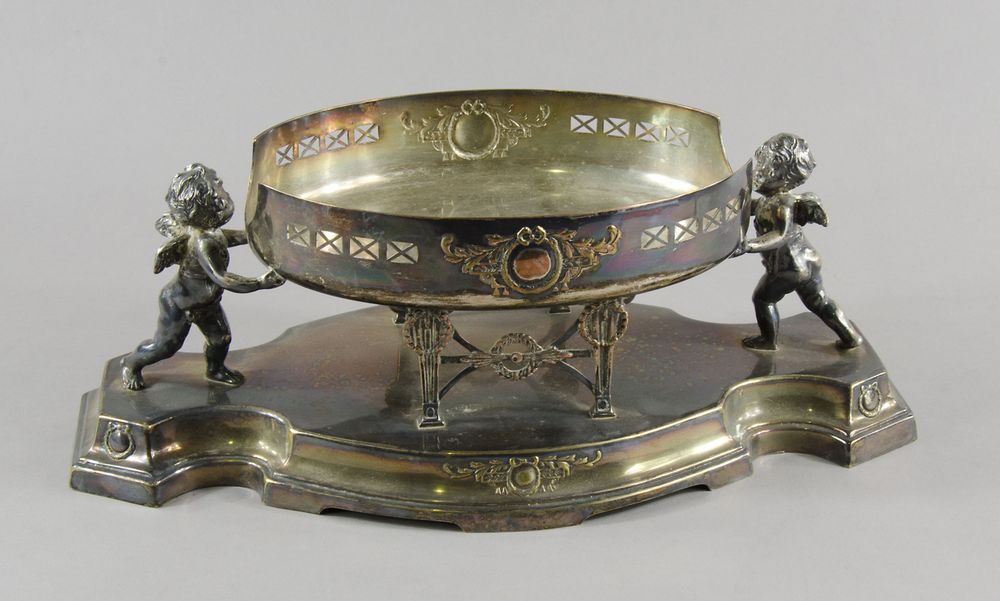 Centrotavola di forma ovale in metallo argentato con 2 figure di putti. Lung....