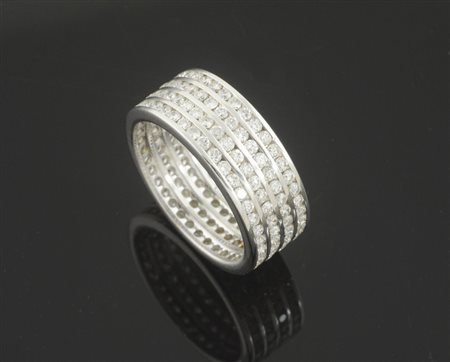 Anello in oro bianco a fascia larga con 40 brillanti disposti su 4 file a tutto giro per ca tot ct 2,20