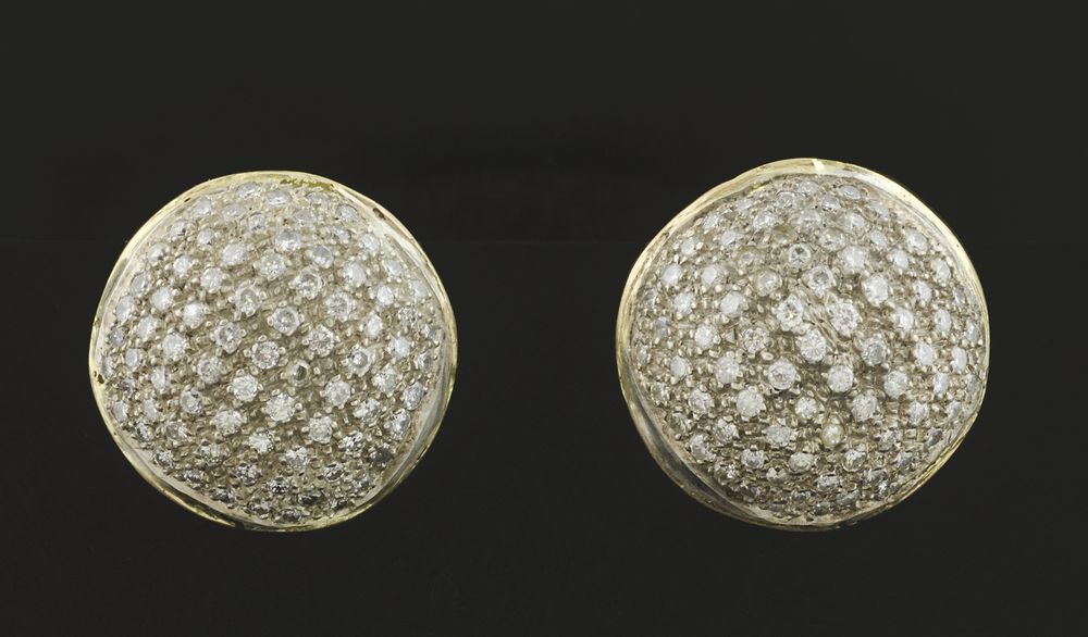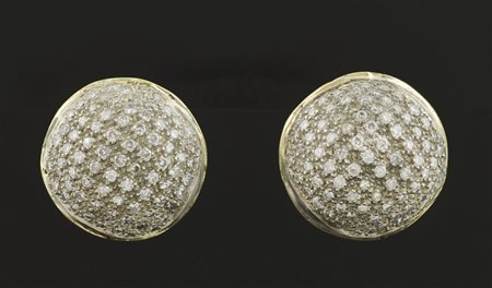 Orecchini in oro giallo e bianco a disco bombato con pavè di 154 diamanti taglio brillante per ca tot ct 3,