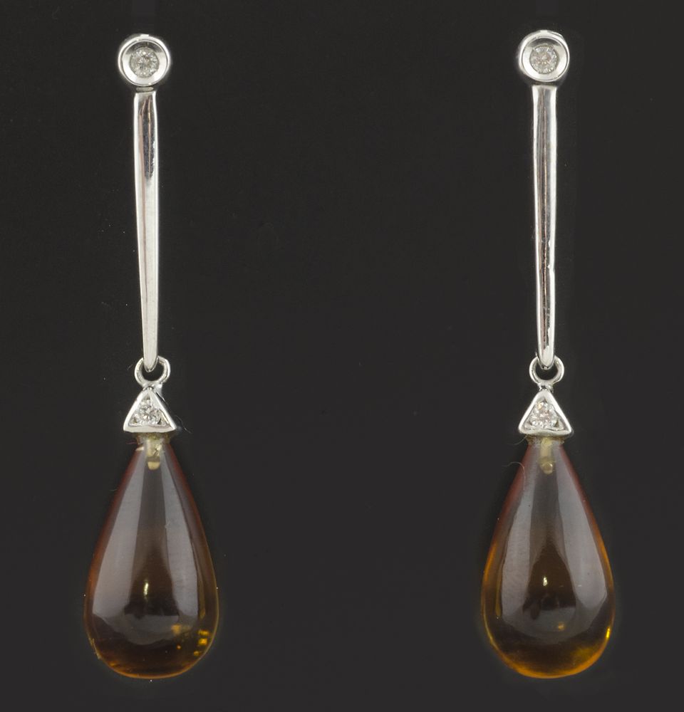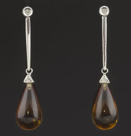 Orecchini in oro bianco a barretta con diamante taglio brillante nella parte superiore, finale a goccia in quarzo citrino