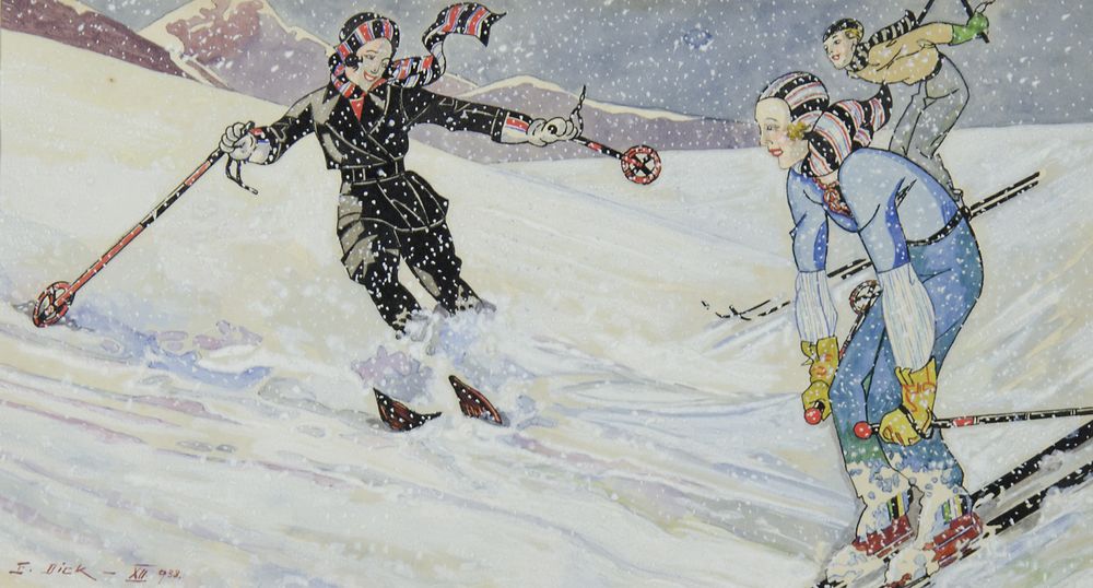 Ernesto Dick Trieste 1889-1959 "Sciatrici" cm. 18x32 - tempera su carta Firmato b. a s. e datato '933.