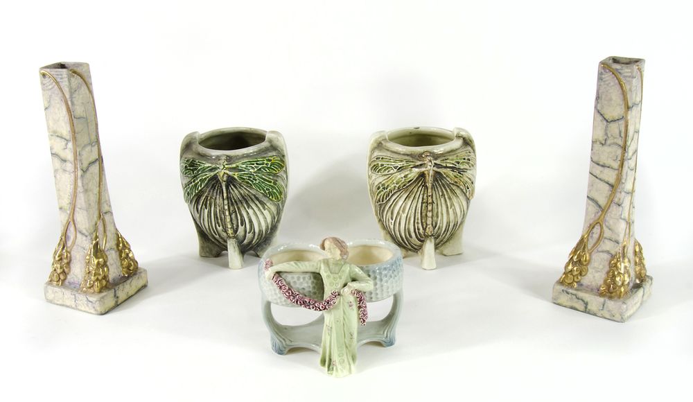 Lotto in ceramica policroma composto da 2 coppie di vasi e contenitore. Epoca Liberty.